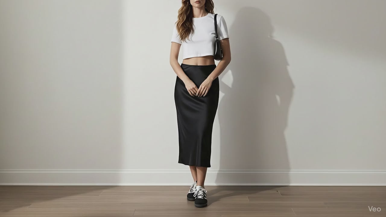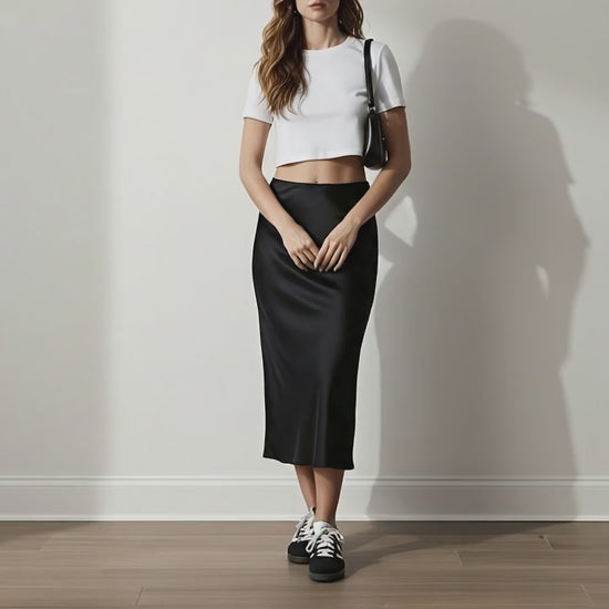 Falda Satén Nude con Top Cropped. Minimalismo y lujo. Corte al bies que estiliza. ¡Tu look chic y casual en un set!