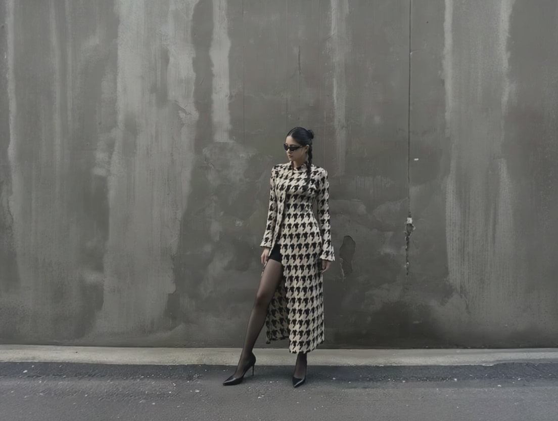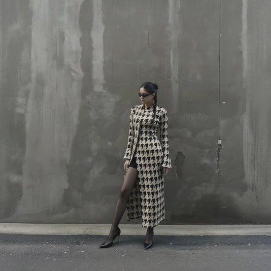 - El diseño pata de gallo añade un toque distintivo a la prenda.